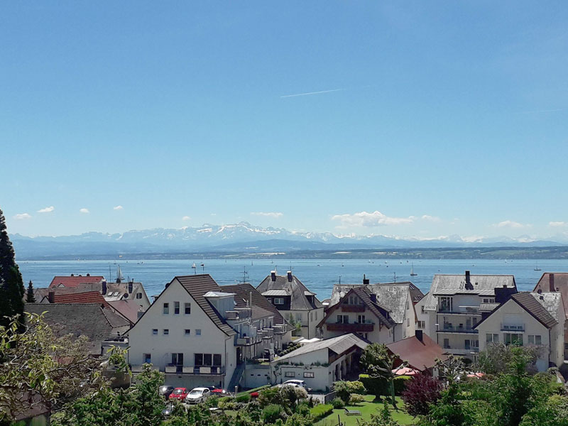 Auf unserem Südbalkon genießen Sie einen traumhaften Blick über die Schweizer Alpen und den Bodensee.