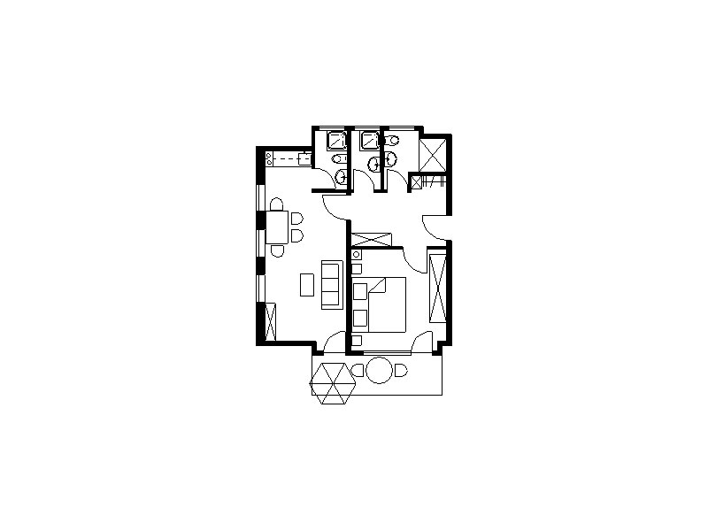 Ebenso bietet die Wohnung ein Schlafzimmer mit Doppelbett, 2 kleine Bäder mit Duschen und ein separates WC.